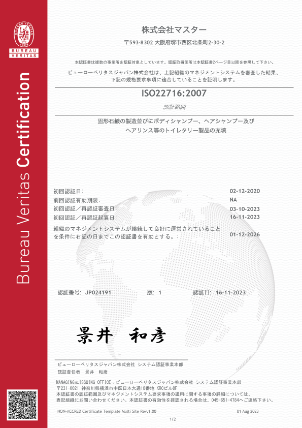 このたび、さらなる品質向上を目指しお客様に満足していただける製品をお届けするために「ISO22716化粧品GMP」認証取得しました。