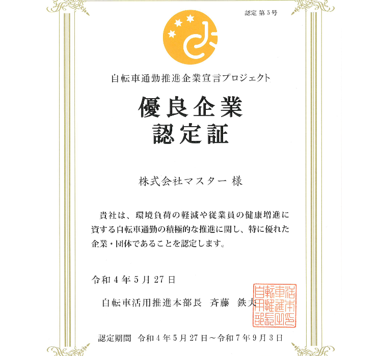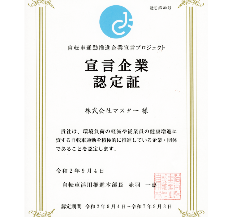 自転車通勤推進企業の認証を取得しました。従業員の健康促進に努めてまいります。