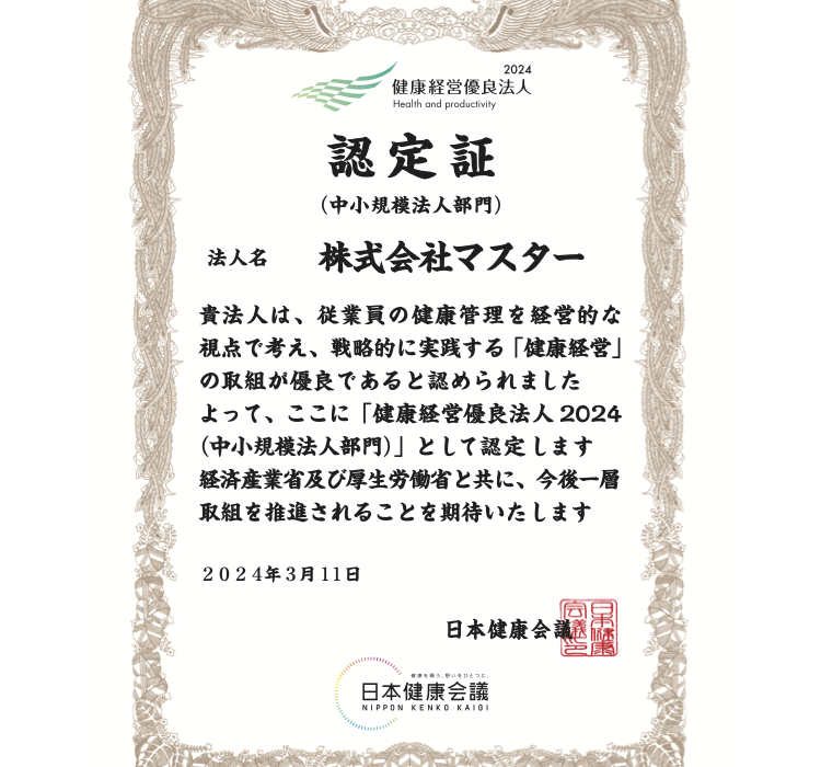 「健康経営」の取り組みが認められ、「健康経営優良法人2024(中小規模法人部門)」として認定されました。今後も引き続き取り組みを続けてまいります。