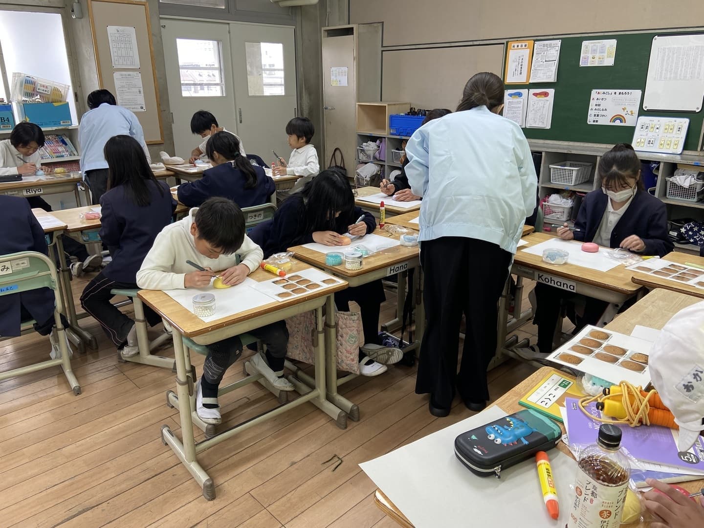 1個目は初心者向けの「ぽんぽんダリア」や「ハリネズミ」、2個目はハート型、葉付き花型のほか、ネコ型や名前入りなど、子どもたちそれぞれのアイデアが形になり、教室にはたくさんの笑顔が広がりました。